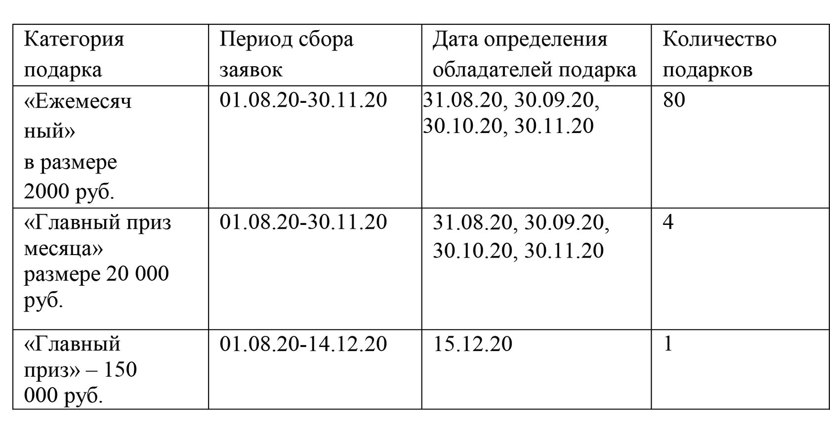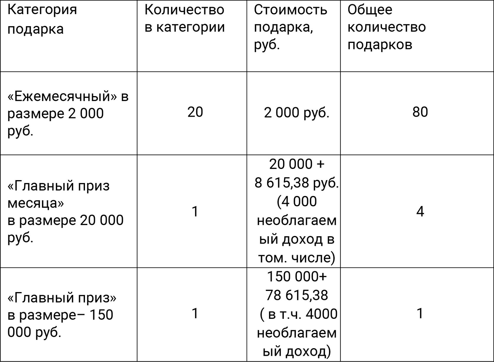 6.1.2. Ежемесячный подарок: 20 000 (двадцать тысяч) рублей в денежном эквиваленте на общее количество 4 шт. (1 приз ежемесячно).
