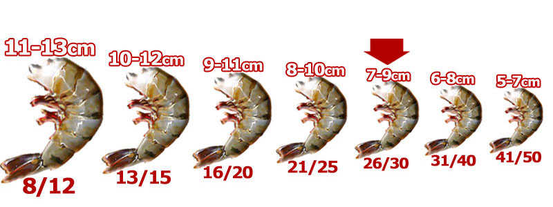 Тигровые креветки могут достигать 30 см в длину. Иногда в килограмме может быть всего 3 штуки. В целом виде продаются только самые крупные креветки, которые имеют размер не менее 21/25. Такие морепродукты часто готовят на гриле или подают в виде самостоятельного блюда.